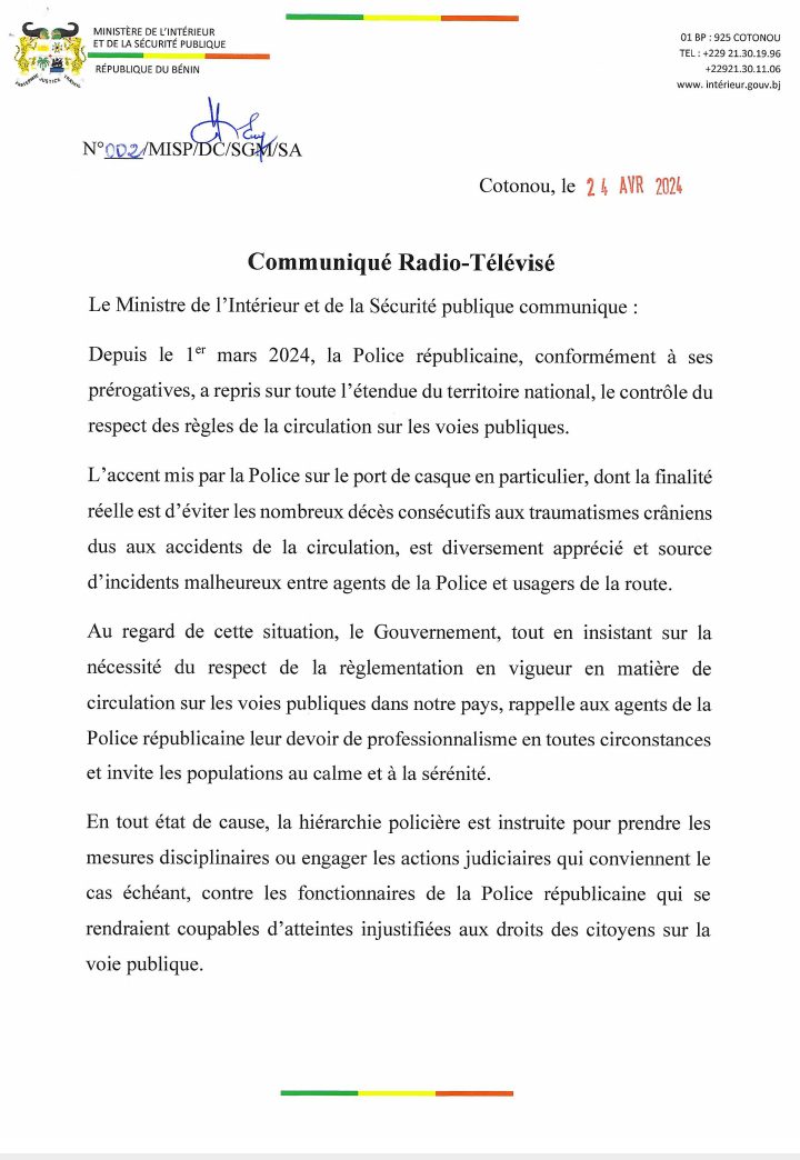 Déplorant les incidents malheureux entre les agents de la police républicaine et les usagers de la route, l’autorité rappelle aux fonctionnaires de la police leur devoir de professionnalisme en toutes circonstances. Ceci, après avoir, après avoir insisté sur la nécessité du respect de la réglementation en vigueur en matière de circulation sur les voies publiques au Bénin. Lire l’intégralité du communiqué.