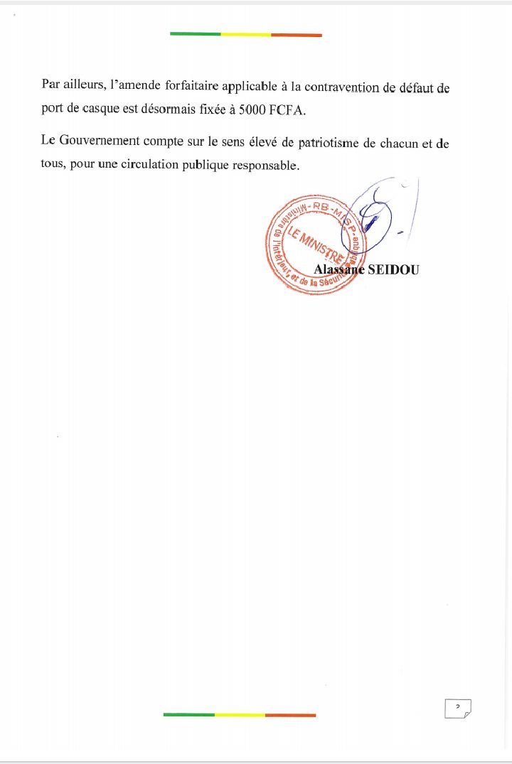 Auparavant fixé à 10.000 FCfa, l’amende forfaitaire relative au défaut de port de casque sur les routes est désormais réduite à 5.000 F Cfa. L’annonce a été faite par le Ministre de l’intérieur et de la Sécurité Publique, à travers un communiqué rendu public ce mercredi 24 avril 2024.