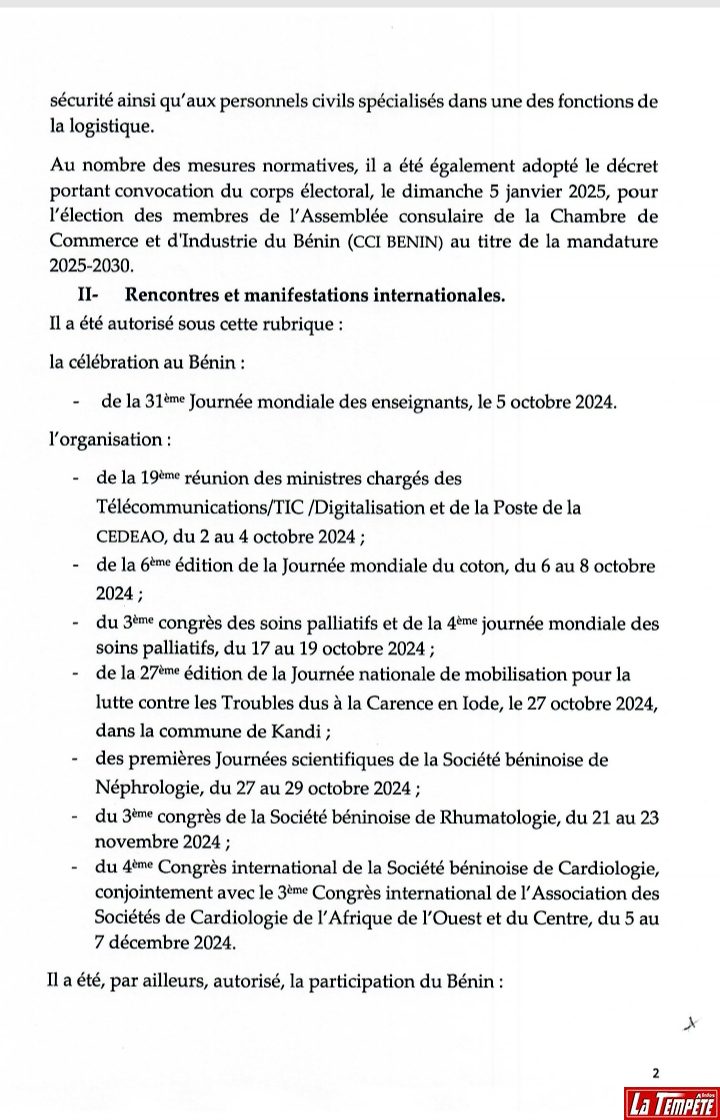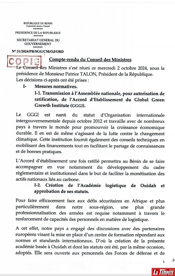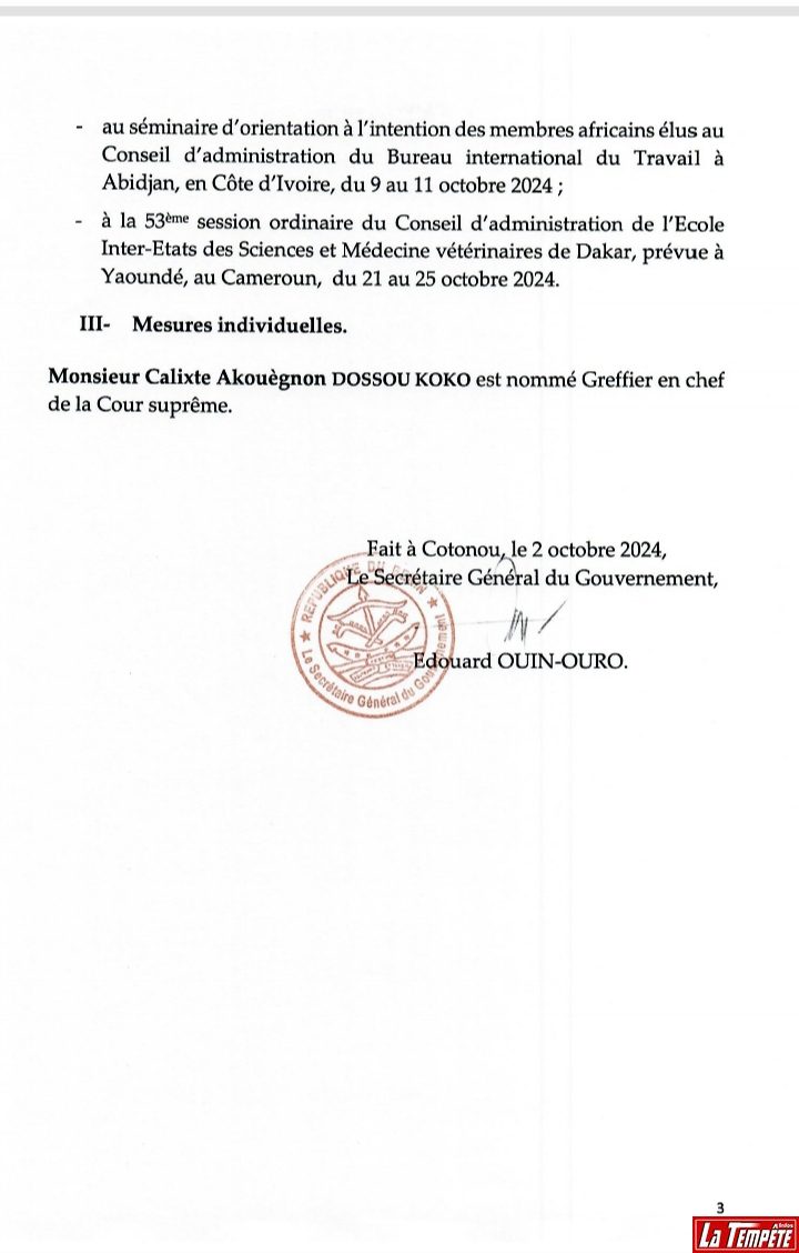 Ce mercredi 2 octobre 2024, une nomination a été prononcée en Conseil des Ministres au Bénin. Il s’agit du nouveau greffier en Chef de la Cour Suprême. Son nom, Calixte Akouègnon DOSSOU KOKO. Lire l’intégralité du compte rendu de la séance hebdomadaire de ce mercredi 2 octobre.