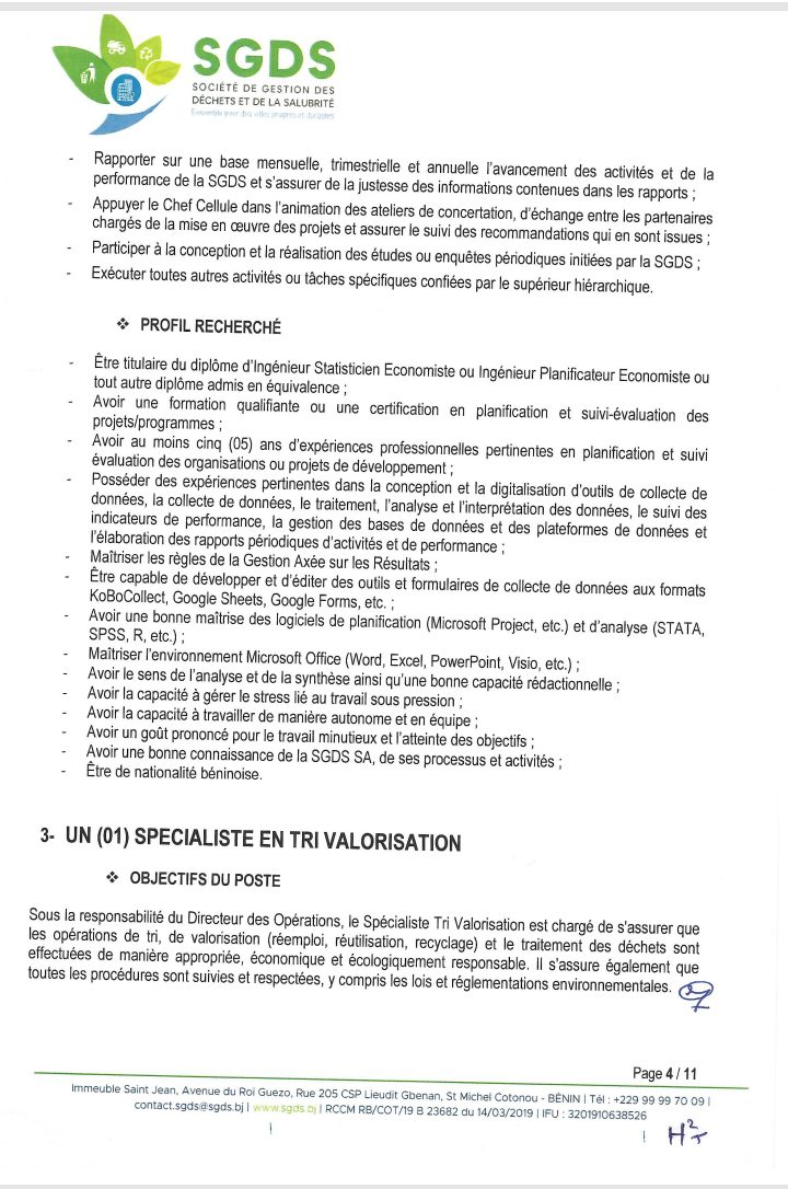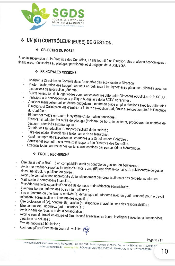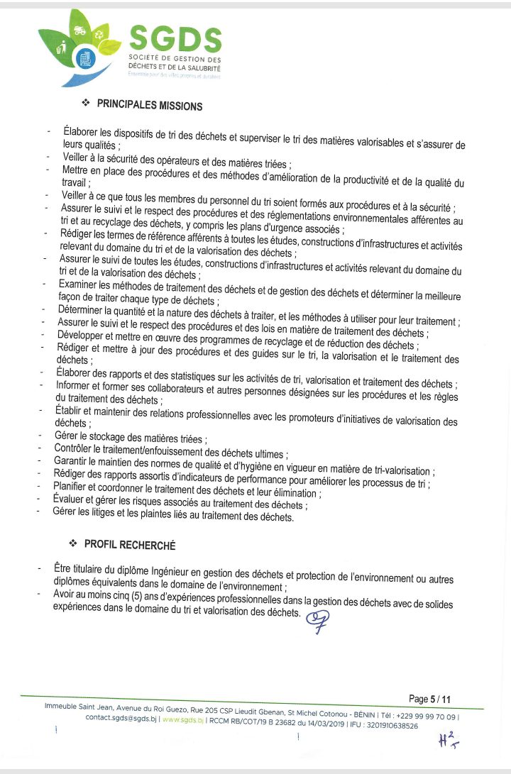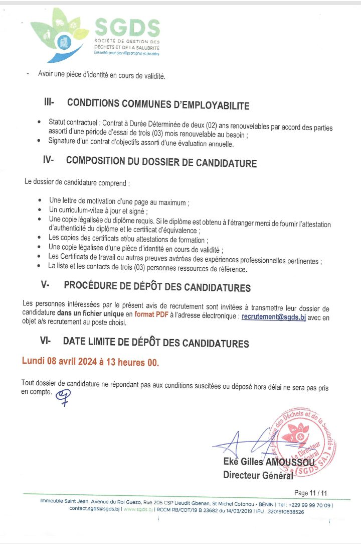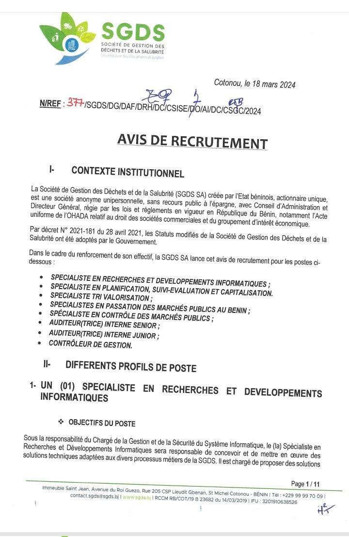 Après un premier recrutement de l’année 2024 en février, la Société de Gestion des Déchets et de la Salubrité (SGDS Sa) lance un nouveau recrutement de plusieurs agents. Lire l’intégralité de l’avis pour les informations utiles.