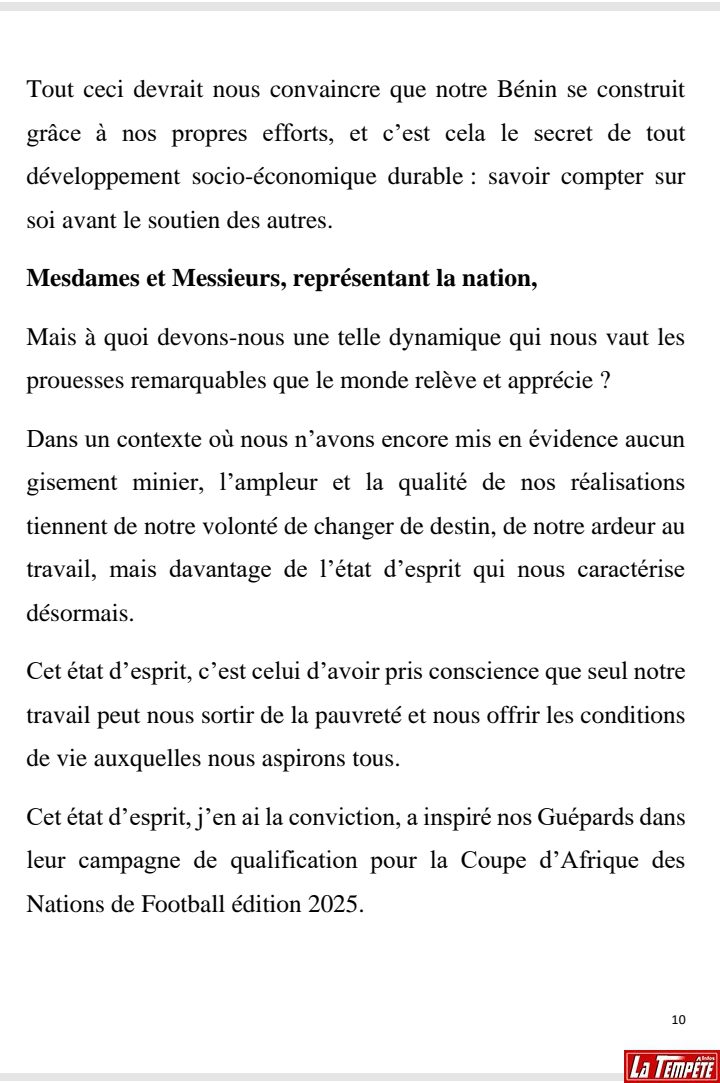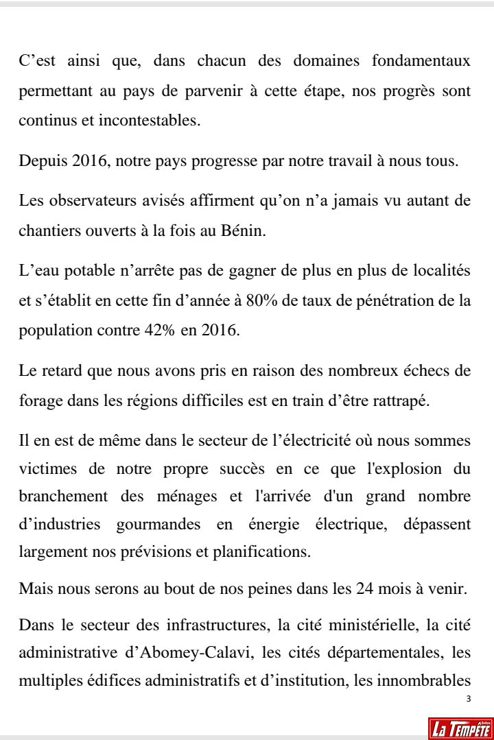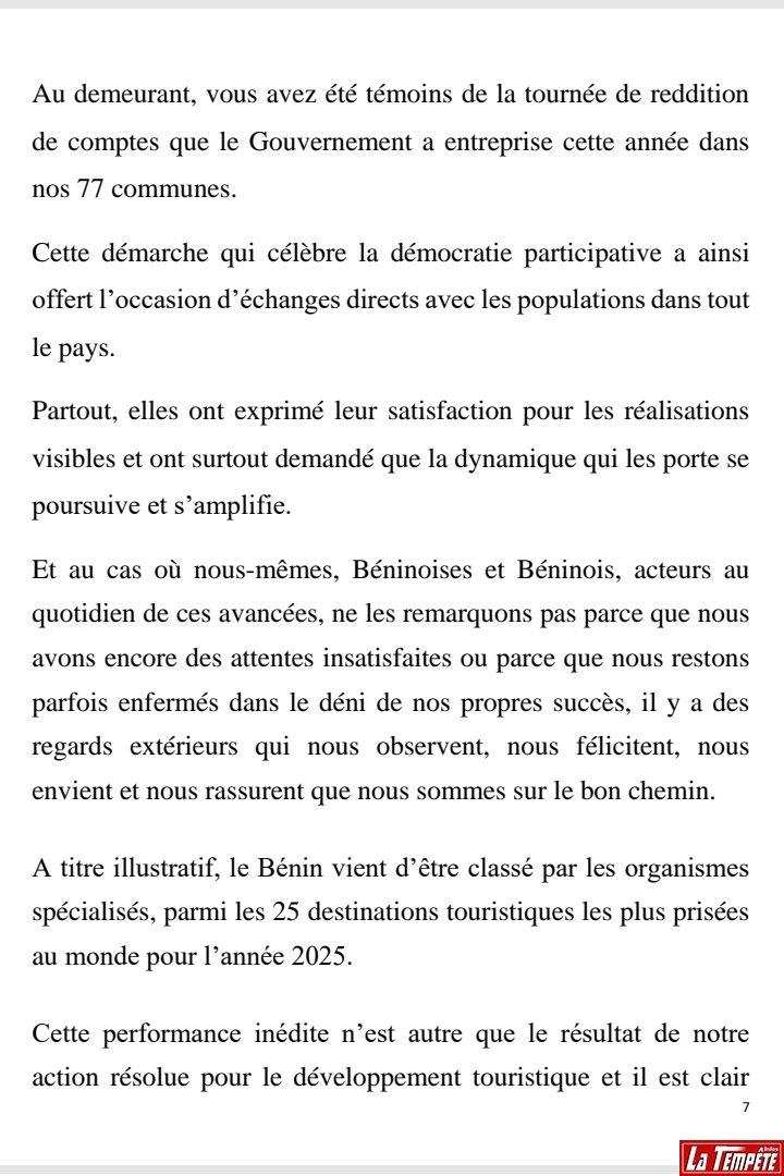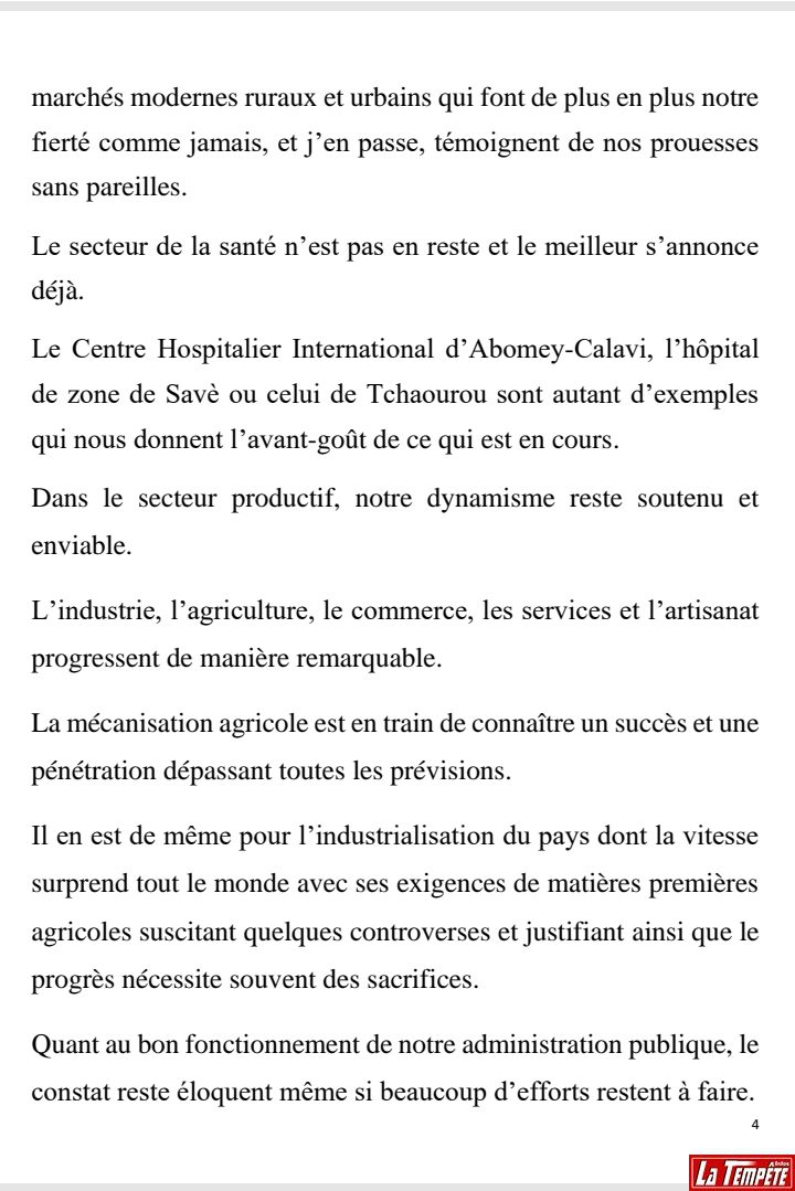 Présentant point par point le bilan de l’année, Patrice Talon a exposé les progrès réalisés dans chaque secteur de développement, tout en relevant les couacs au niveau de deux secteurs qui sont encore à la traîne, à savoir la cherté de la vie et le défi face au terrorisme dans la zone septentrionale du Bénin.