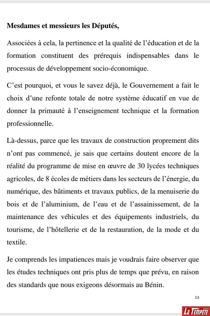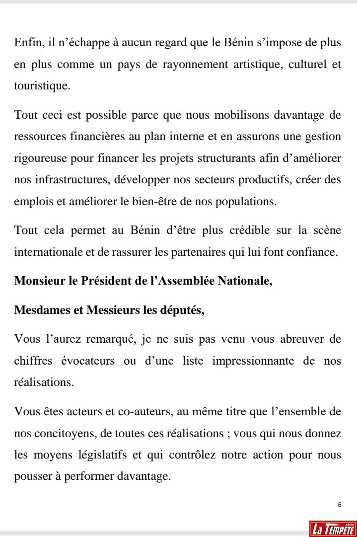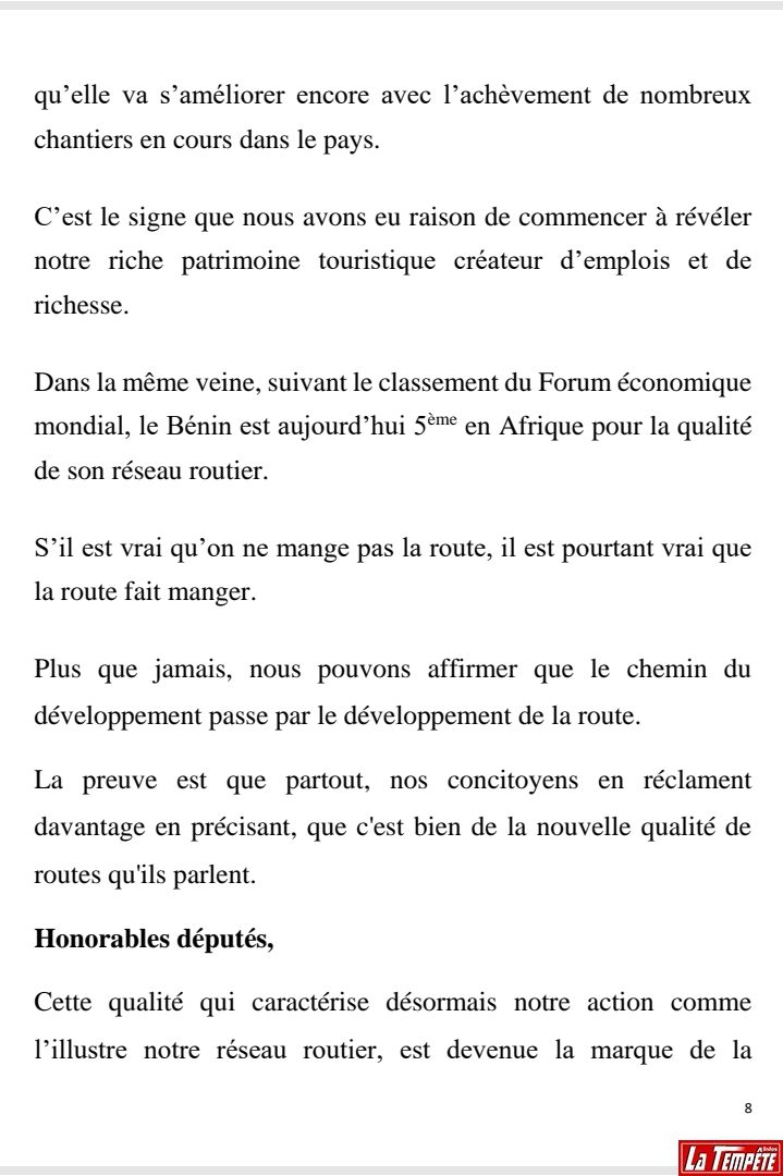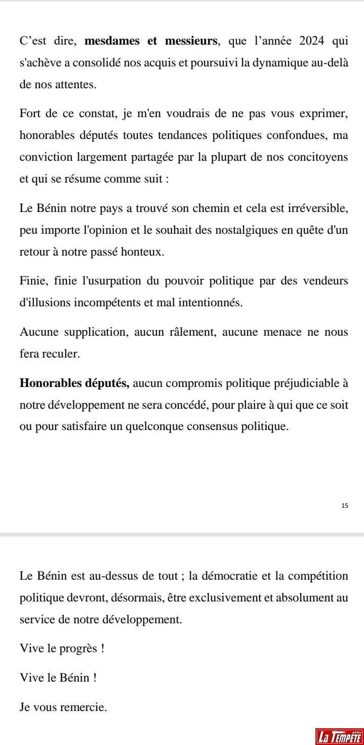 Présentant point par point le bilan de l’année, Patrice Talon a exposé les progrès réalisés dans chaque secteur de développement, tout en relevant les couacs au niveau de deux secteurs qui sont encore à la traîne, à savoir la cherté de la vie et le défi face au terrorisme dans la zone septentrionale du Bénin.