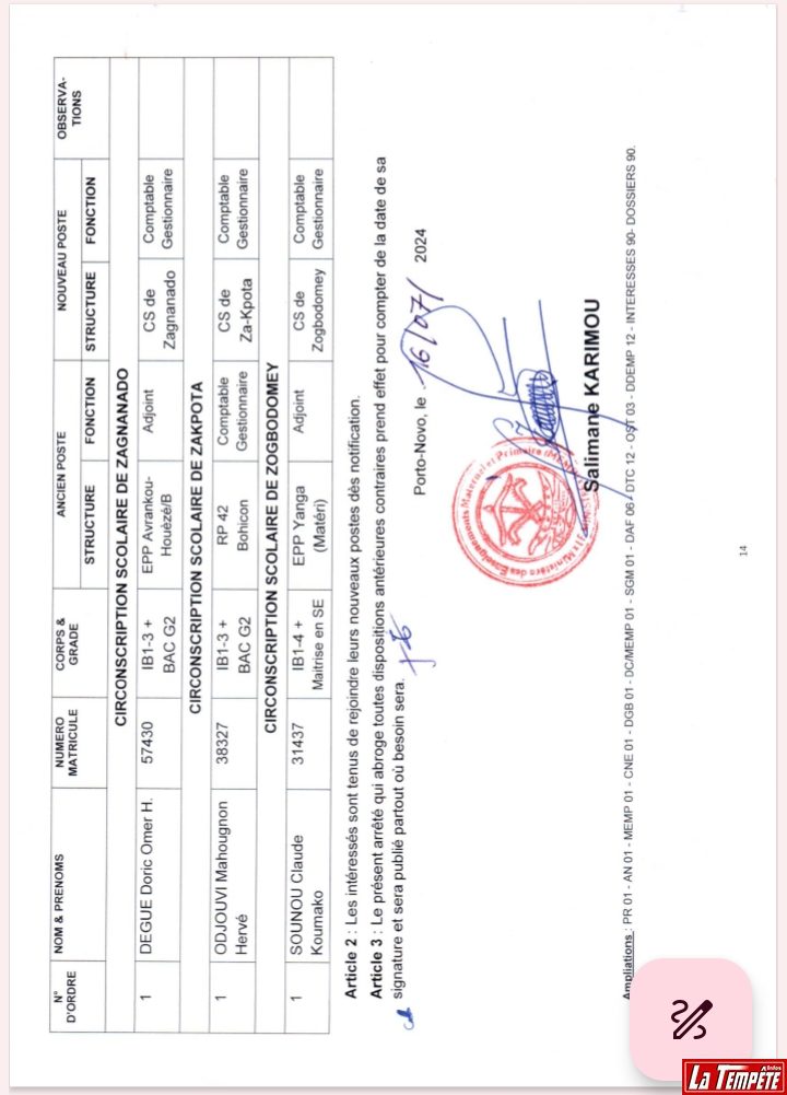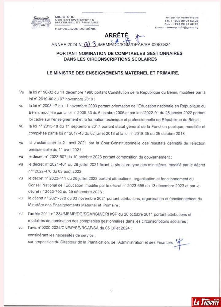 Au Bénin, de nouveaux comptables ont été nommés, pour gérer les circonscriptions scolaires. La nomination a été officialisée, mardi 16 juillet 2024, par le Ministre des enseignements maternel et primaire, Salimane Karimou. Au nombre de 90 au total, les comptables gestionnaires concernés ont été positionnés au niveau des différentes circonscriptions scolaires dans tous les départements. Ils ont pour mission, la gestion efficiente des subventions accordés aux écoles.