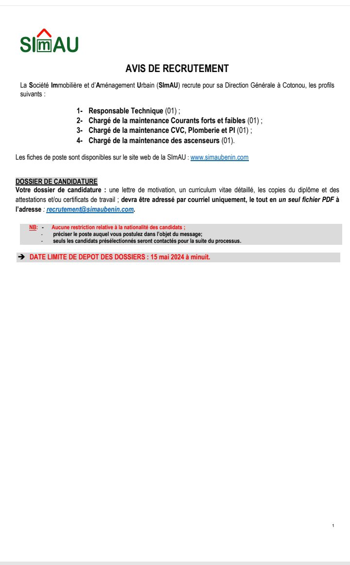 Les dossiers de candidature doivent comporter une lettre de motivation, un curriculum vitae détaillé, les copies du diplôme et des attestations et/ou certificats de travail ; devra être adressé par courriel uniquement, le tout en un seul fichier PDF à l’adresse:👉🏾 recrutement@simaubenin.com.