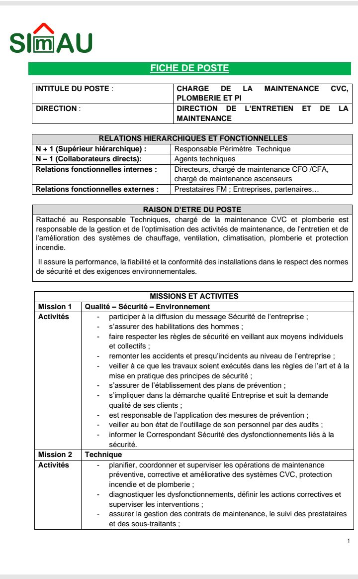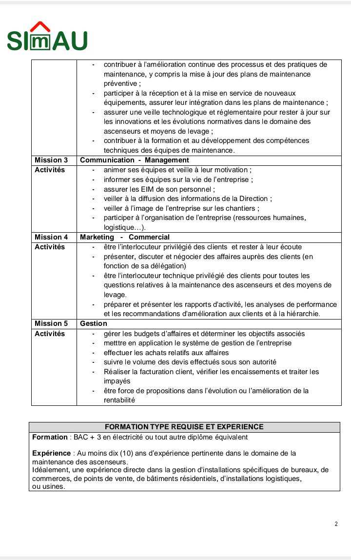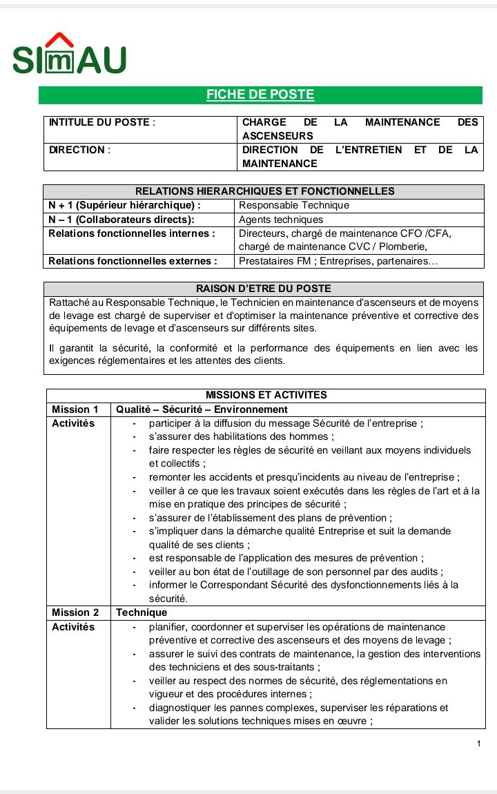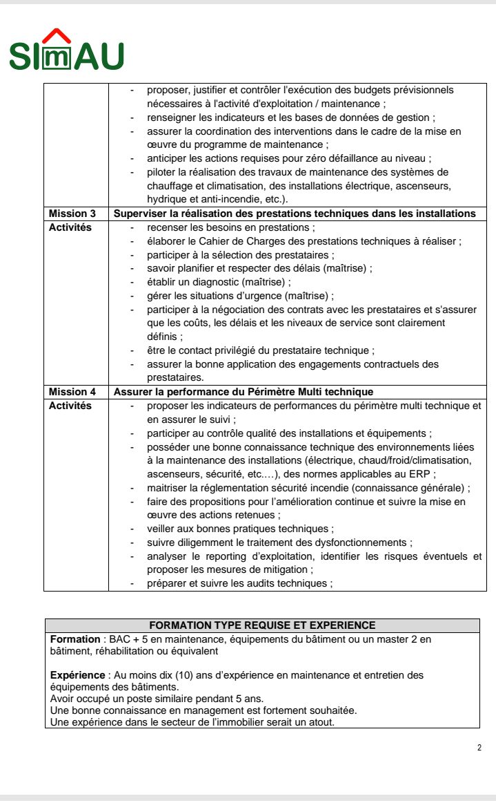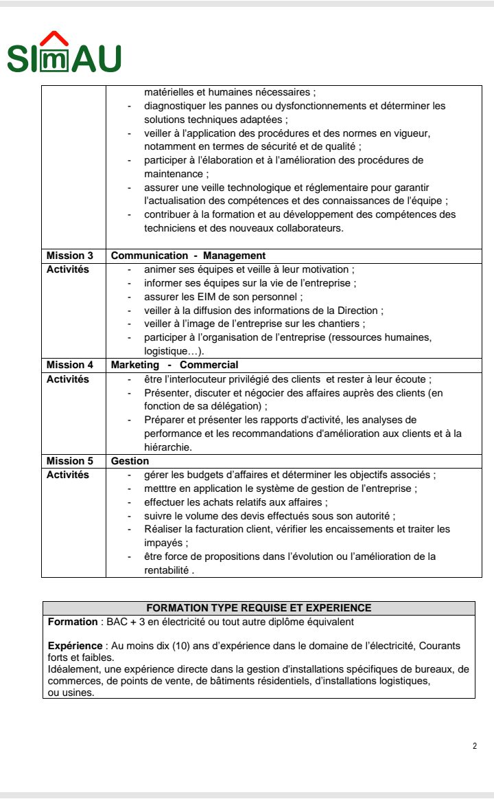 Au Bénin, la Société Immobilière et d’Aménagement Urbain (SImAU) lance un recrutement pour de nouvelles compétences au sein de sa direction générale à Cotonou. Les quatre (4) profils recherchés sont : Responsable Technique (01); Chargé de la maintenance Courants forts et faibles (01): Chargé de la maintenance VC, Plomberie et Pl (01) et Chargé de la maintenance des ascenseurs (01).
