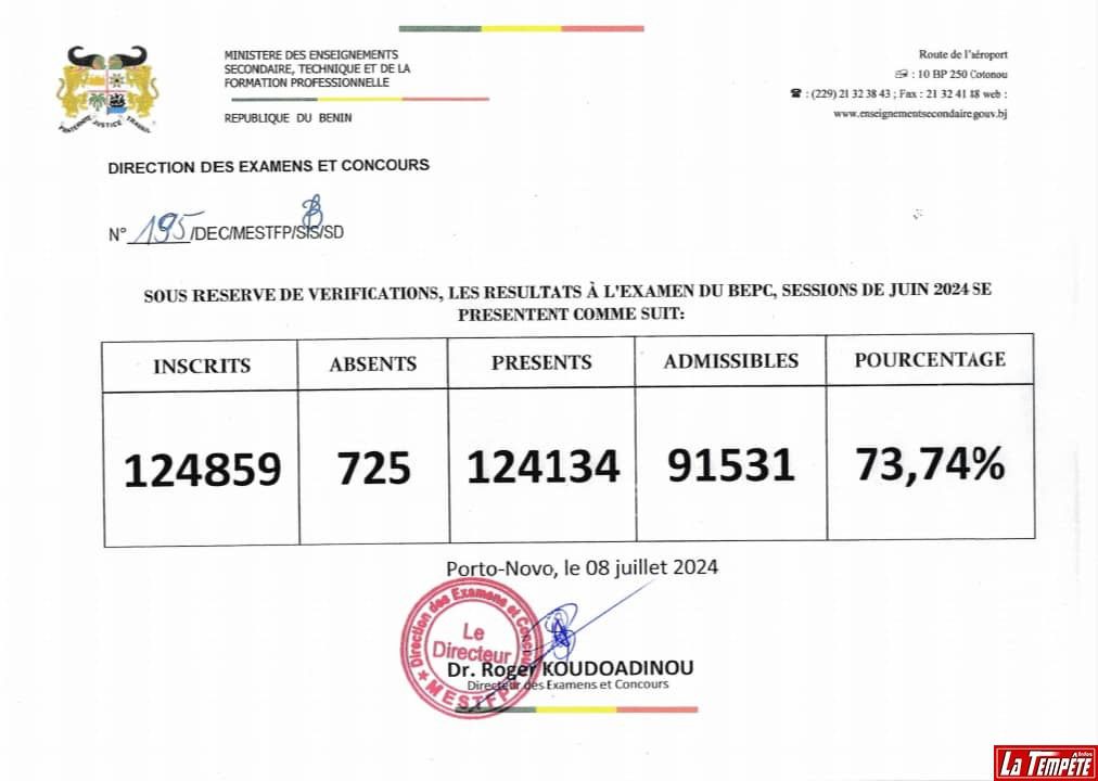 Après l’étape des compétitions déroulée du 10 au 13 juin 2024, les résultats du Brevet d’étude du Premier Cycle (BEPC) sont déjà dévoilés ce lundi 8 juillet 2024. Selon les résultats rendus publics par le directeur des examens et concours, Roger Koudoadinou, 73,74% des candidats ayant composé sont admissibles, en attendant les résultats définitifs après la composition des épreuves orales et sportives.