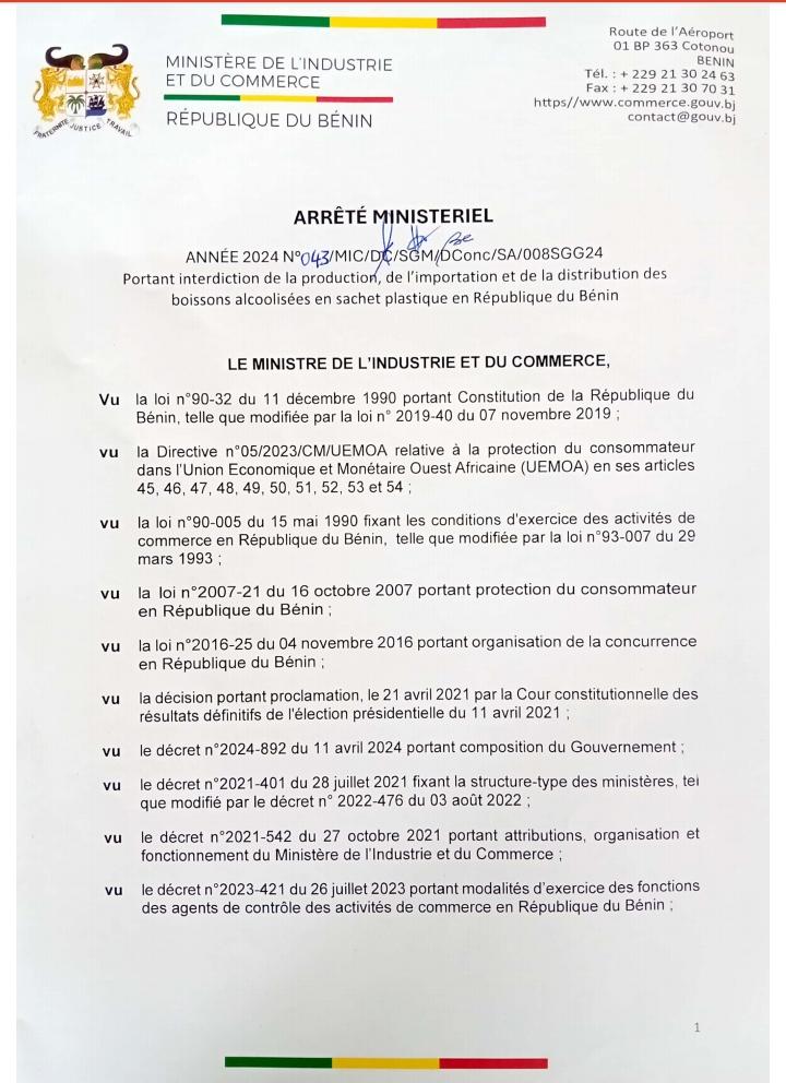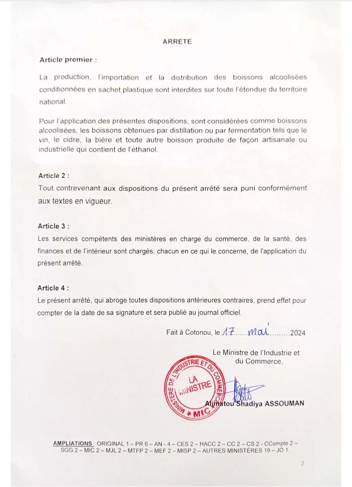 Au Bénin, la consommation, la production, l’importation et la distribution de boissons alcoolisées en sachet plastique sont désormais interdits sur toute l’étendue du territoire national. La décision a été actée par la ministre de l’Industrie et du Commerce, Alimatou Shadiya Assouman, à travers un arrêté ministériel signé en date du 17 mai 2024.