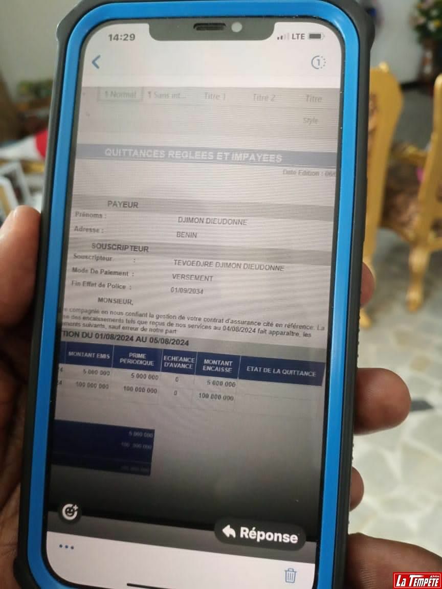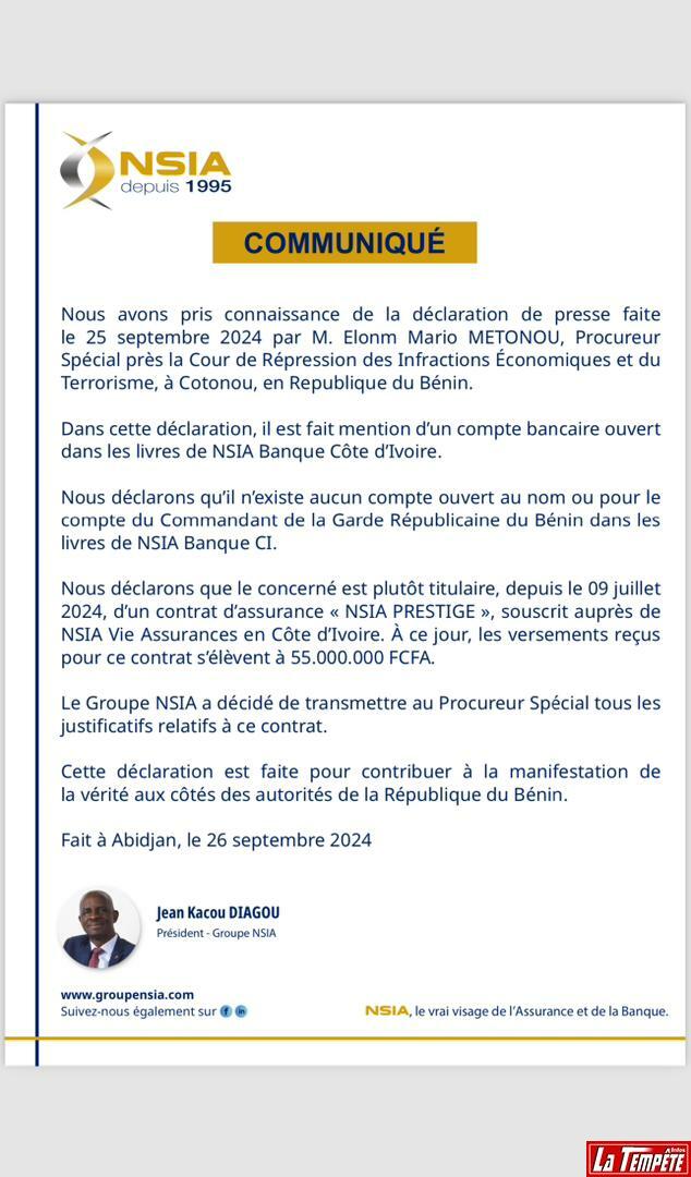 Néanmoins, le responsable du groupe reconnaît l’existence d’un contrat d’assurance au sein de leur entreprise. « Nous déclarons que le concerné est plutôt titulaire, depuis le 09 juillet 2024, d’un contrat d’assurance NSIA PRESTIGE », souscrit auprès de NSIA Vie Assurances en Côte d’Ivoire. À ce jour, les versements reçus pour ce contrat s’élèvent à 55.000.000 FCFA. Le Groupe NSIA a décidé de transmettre au Procureur Spécial tous les justificatifs relatifs à ce contrat. Cette déclaration est faite pour contribuer à la manifestation de la vérité aux côtés des autorités de la République du Bénin », précise le communiqué signé par Jean Kacou Diagou.