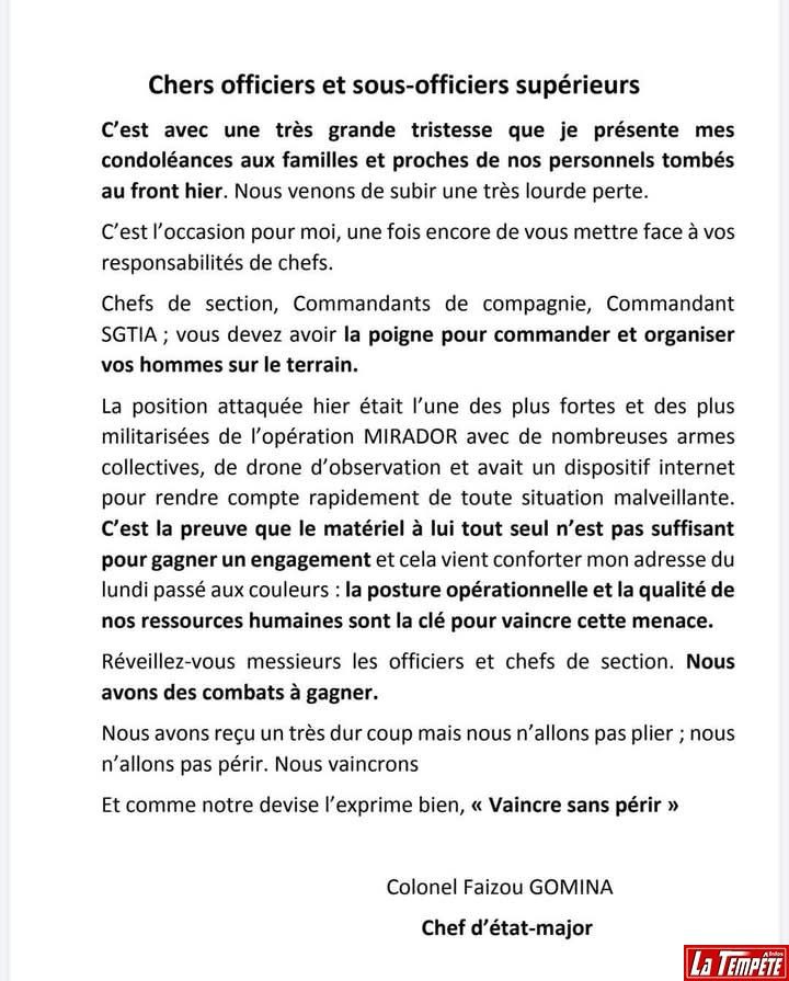 Au nombre des 28 soldats Béninois tués, figurent le capitaine Soukpon, le lieutenant stagiaire Kpognon, le SCH Aklinon, la SCH Kiti, le SD1 Soulin, le Sd2 Djessou C/20. Cependant, malgré la lourde perte de leur côté, l’armée béninoise, dans sa riposte pendant l’attaque qu’elle a subie, a réussi à neutraliser des dizaines de présumés djihadistes. Difficile de dire le nombre d’assaillants tués. Mais on parle d’environ une cinquantaine de perte côté djihadistes.