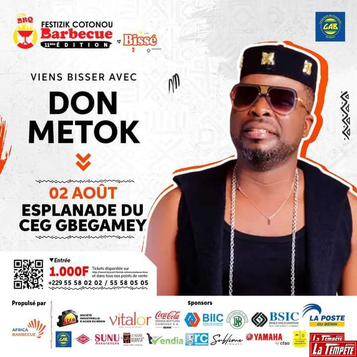 Encore deux (2) autres soirées (samedi 3 août et dimanche 4 août 2024), et la 11è édition du Festizik Cotonou Barbecue qui se déroule sur le terrain de sport du CEG GBÉGAMEY, sera clôturée. Ce vendredi 2 août 2024, alors que la 9è soirée continue de mobiliser une impressionnante foule sur le site, les artistes au rendez-vous défilent à tour de rôle sur le podium, pour offrir leurs prestations au public.En tête d’affiche des vedettes programmées ce soir, Don Métok, le précurseur de l’hymne de l’équipe nationale de football, les Guépards du Bénin. Selon les indiscrétions, l’artiste entend servir un répertoire composé de ses trois (3) albums les plus populaires à savoir C’est la Vie, Hongan (la clé) et Fènou (la grâce).