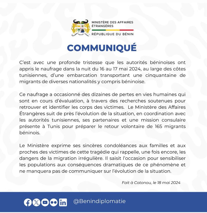 Dans la nuit du 16 au 17 mai 2024, une cinquantaine de migrants dont plusieurs Béninois ont trouvé la mort lors du chavirement d’une bateau au large des côtes de la Tunisie. Il s’agissait d’une embarcation irrégulière transportant une cinquantaine de migrants de différentes nationalités, en route pour l’Europe, au nom de la recherche du bonheur.