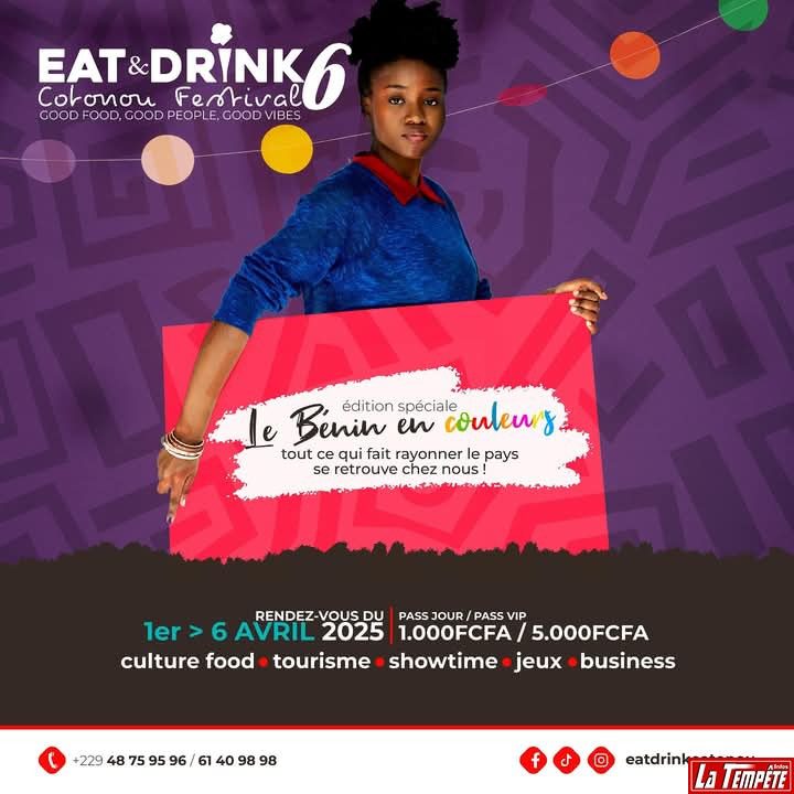 Annoncée avec grosse ferveur, la 6è édition du festival « Eat & Drink » s’installe au palais des congrès de Cotonou, du mardi 1er au dimanche 06 avril 2025. Grand événement de divertissement, de gourmandise et de promotion des spécialités culinaires et des boissons made in Benin et l’Afrique, la 6è édition du festival va faire bouger Cotonou à travers des moments de dégustation, showtime, business, jeux, tourisme, etc.