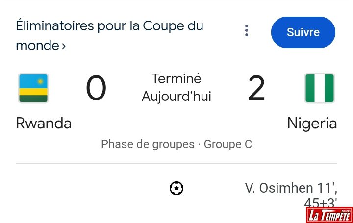 De la 5è place auparavant, les Supers Eagles du Nigéria ont gagné une place ce vendredi 21 mars. En déplacement à l’étranger, les protégés d’Éric Sékou Chelle ont surpris le Rwanda, à travers un score de 2 buts à 0, grâce à un doublé de l’attaquant de Galatasaray, Victor Osimhen. Résultats, les « Amavubi » perdent ainsi leur place de leader du groupe pour se retrouver à la 3è place désormais, à l’issue de la 5è journée.