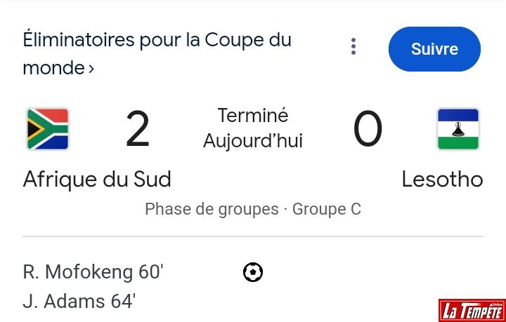 Précédemment 2è du groupe, les Banfana Banfana de l’Afrique du Sud montent en puissance et arrachent la première place, après avoir battu le Lesotho par un score de 2 buts à 0. Ce qui fait perdre une place au Lesotho, dans le classement du groupe C.