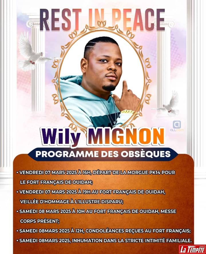 Une fois encore, la direction générale de La Tempête Infos présente ses sincères condoléances à toutes la famille et proches de l’artiste Wily Mignon et compatit aux douleurs qu’ils ressentent en cette période difficile qu’ils traversent. Que l’âme du concepteur du Noudjihou repose en paix.