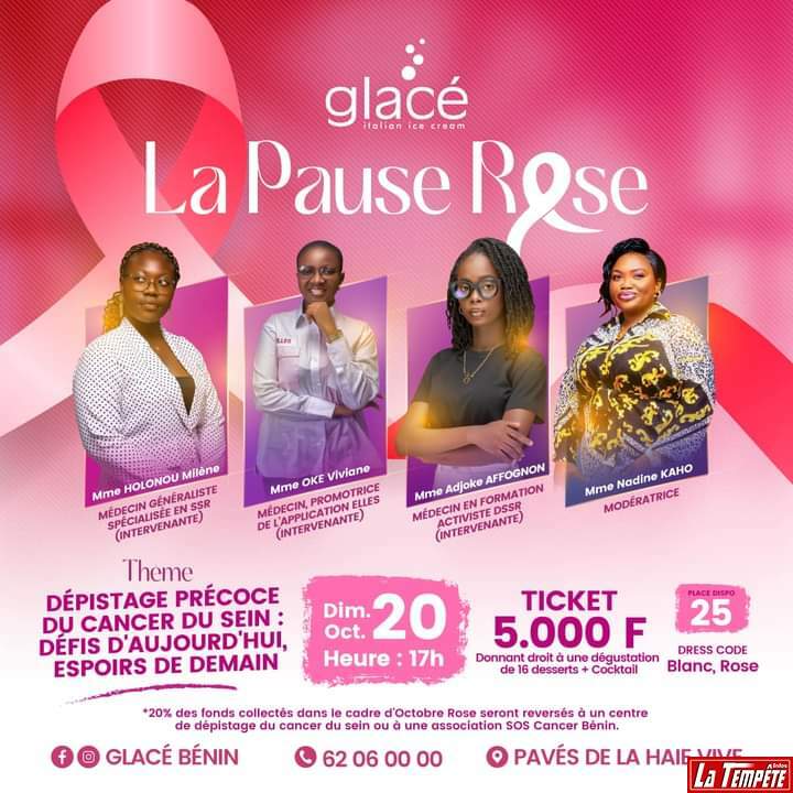 Pandémie à la base de nombreuses pertes en vies humaines chez la gent féminine, la lutte contre le cancer du sein devient de plus en plus, une préoccupant majeure. Au Bénin, dans le cadre de l’Octobre Rose, période dédiée à la lutte contre le mal, le restaurant glacier et spécialiste des desserts intitulé Glacé situé à Cotonou dans la Haie Vive et en face du Calypso Night Club, organise « la Pause Rose« , une séance une sensibilisation au profit des femmes.