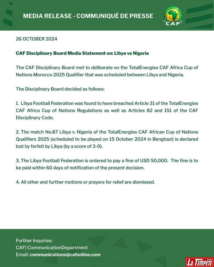 Longtemps attendue, la Confédération africaine de football (CAF) vient de donner ce samedi 26 octobre 2024, son verdict en sanctionnant la Libye, suite à son match manqué face aux Super Eagles du Nigeria le mardi 15 octobre dernier, dans le cadre de la 4è journée des éliminatoires de la Coupe d’Afrique des Nations Maroc 2025.