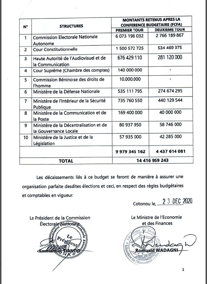 A l’occasion d’un point de presse co-animé ce mercredi 23 décembre 2020, suite aux travaux en commission budgétaire tenue par la Commission Électorale Nationale Autonome (CENA) et le Ministère de l’Économie et des Finances, le budget adopté a été dévoilé : 14.416.959.243 FCFA (quatorze milliards, quatre-vingt seize millions, neuf-cent cinquante neuf mille, deux-cents quarante trois francs CFA).