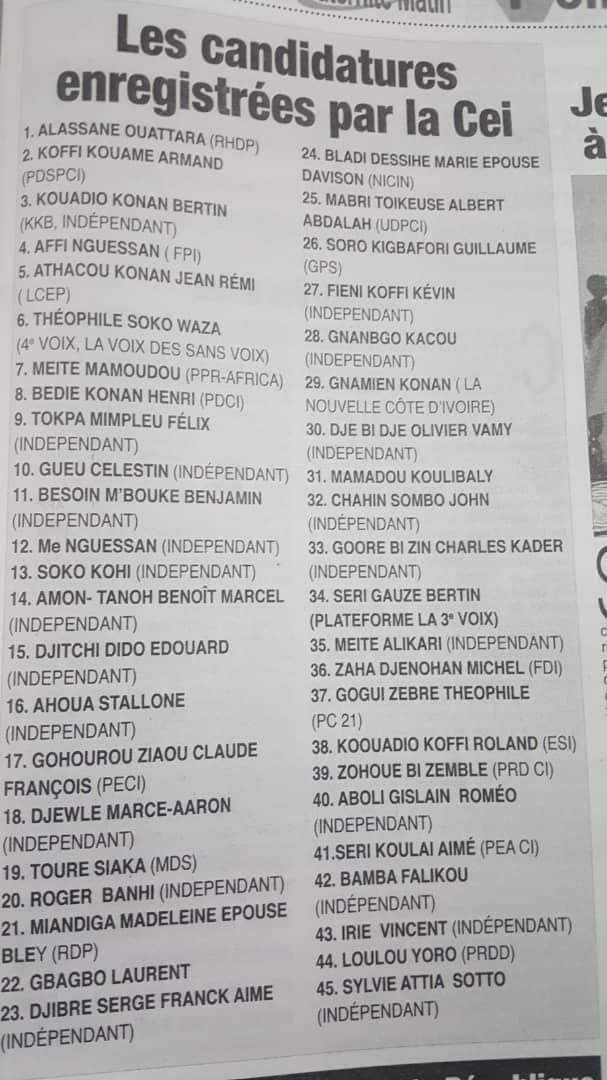 Issus des partis et mouvements politiques légalement enregistrés, les candidats enregistrés par l’institution chargée d’organiser le scrutin du 31 octobre prochain sont issus en majorité du camp de l’opposition dont les grosses pointures sont : Guillaume Soro, Laurent Gbagbo, Pascal Affi N’Guessan, Henry Konan Bédié.