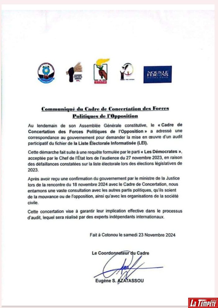 L’objectif du cadre de concertation des forces politiques de l’opposition est clair : « …garantir leur implication effective dans le processus d’audit », au nom d’une action inclusive pour sa réussite. En effet, l’audit du fichier électoral du Bénin suscitée par le parti de l’opposition « Les Démocrates » fait suite aux « défaillances constatées sur la liste électorale lors des élections législatives de 2023 ». Cette mission qui sera assurée par des experts internationaux indépendants bientôt commis, devrait non seulement rassurer les formations politiques, mais aussi apaiser les citoyens, en vue des élections générales inclusives et transparentes en 2026 au Bénin.