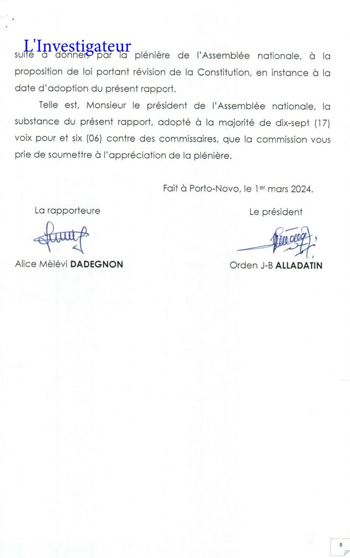 Lire l’intégralité du rapport de la commission des lois, de l’administration et des droits de l’homme, à l’issue du vote qui a clôturé la première session extraordinaire de l’année 2024, à l’assemblée nationale du Bénin.
