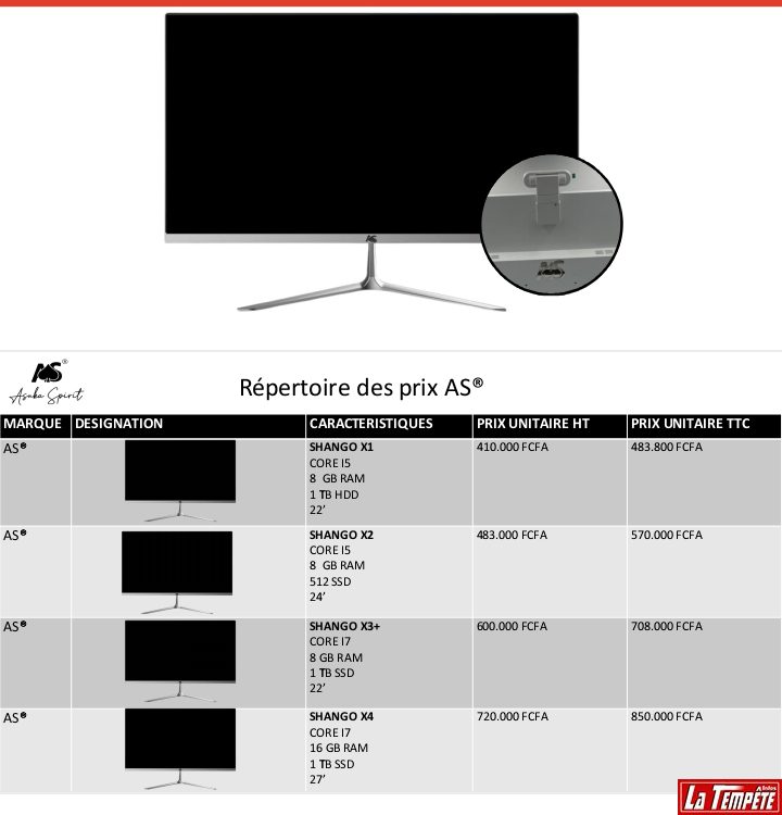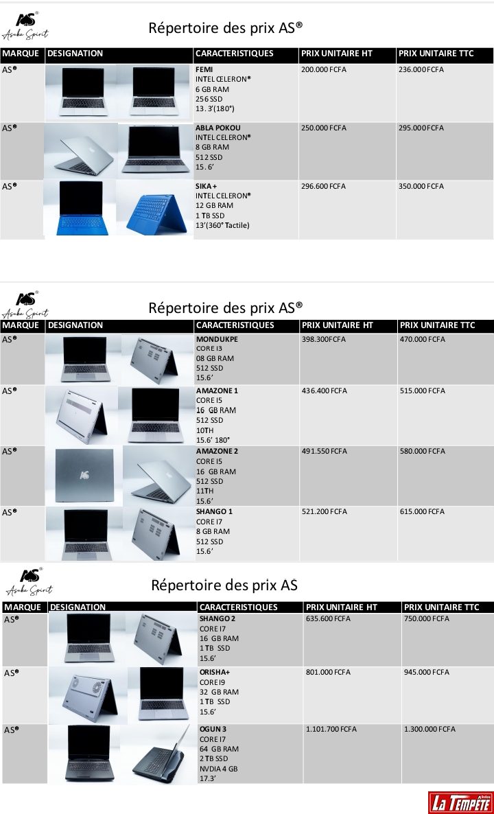 C’est en effet, pour solutionner le besoin criard d’ordinateurs abordables sur le continent africain, avec un service après-vente disponible et de qualité. Pour concrétiser cette ambition, il a fondé en 2021 AS World Tech, la startup africaine à suivre selon Forbes France. Il fabrique et met en vente des ordinateurs portables et de bureau (all on one) de dernière génération baptisés FÈMI, FUNKÈ, AMAZONE, OGUN, ABLA POKU, SIKA, MONDUKPÈ, ORISHA, IFÈ dont voici un récapitulatif de leurs caractéristiques.