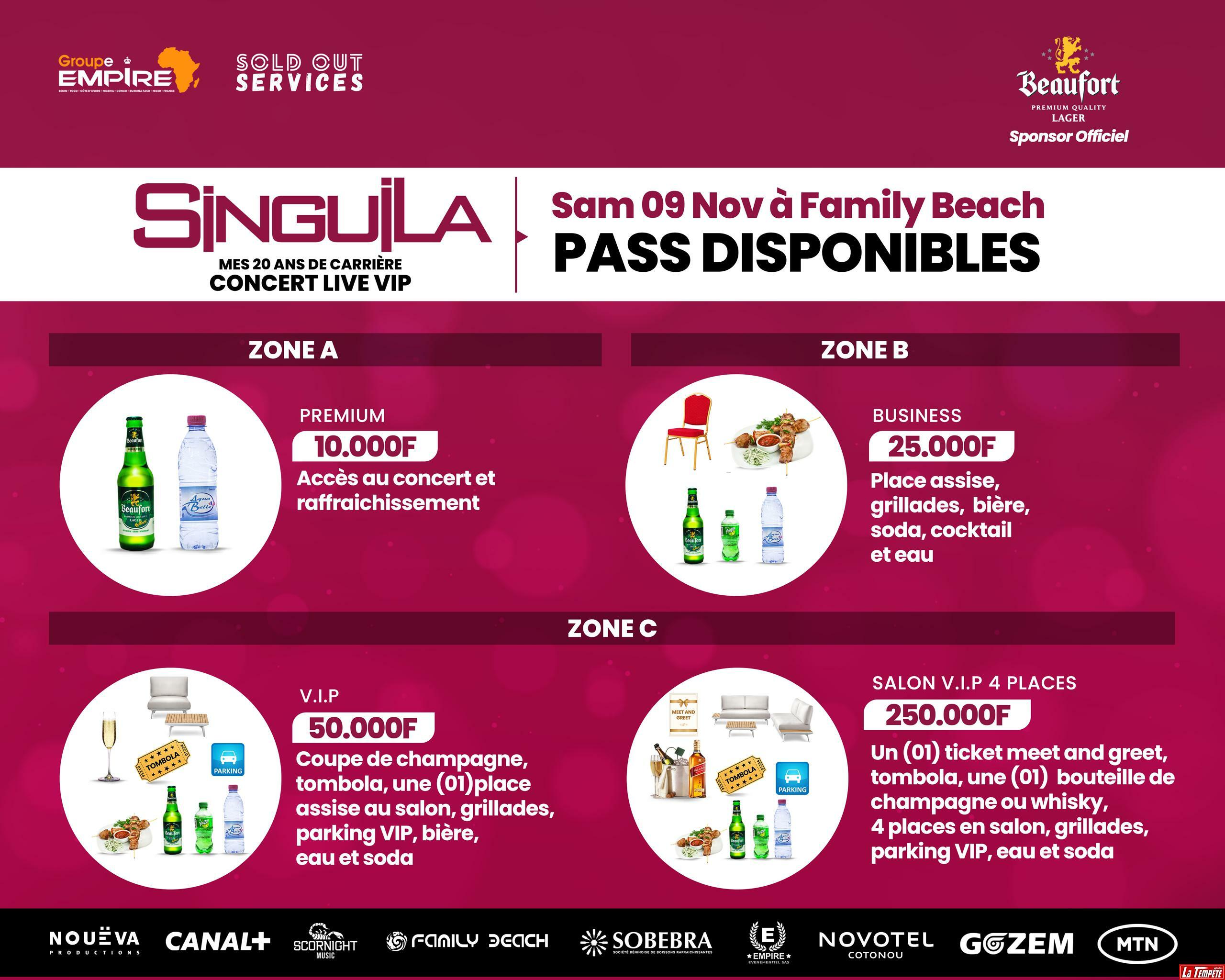 Dans le cadre de la célébration des 20 ans de ses hits, la star Singuila descend à Cotonou, le samedi 9 novembre 2024, pour un géant concert live VIP, du côté de Family Beach. Fixés à 10.000 FCfa, à 25.000 FCfa, à 50.000 FCfa et à 250.000 FCfa, voici tous les avantages liés aux différents billets d’entrée au spectacle organisé par Empire Événementiel du Groupe Empire en partenariat avec Sold Out services.